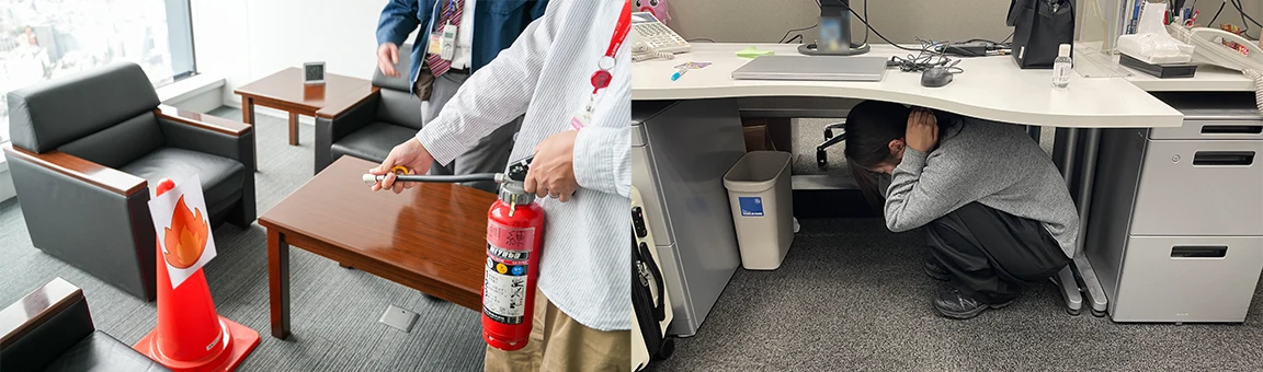 はじめに、「地震発生」の訓練放送が流れ、スタッフは机の下に隠れて身の安全を確保しました。その後、当社の火災感知器が作動した想定で再び放送が入り、現場確認に向かったスタッフが発火を確認。「火事だ!」と周囲に知らせ、迅速に防災センターへ連絡しました。並行して、別のスタッフが消火器を使用して初期消火を試みましたが、今回は「初期消火が失敗した」という想定のもと、直ちに119番通報と避難誘導が行われました。負傷者役のスタッフの搬送も実施され、緊迫感のある訓練となりました。