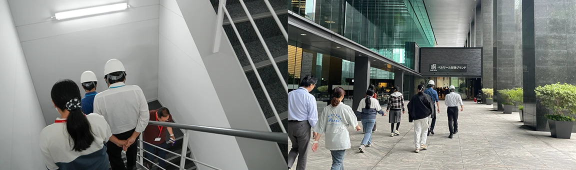 エレベーターが停止した想定のもと、防火扉の奥にある特別避難階段を使用し、当社のオフィスがある33階から1階まで避難しました。私は1階まで降りるのに約10分かかりました。早歩きでの下りでしたが、20階を過ぎたあたりから脚への負担を感じ、翌日には筋肉痛になりました。非常時に備えて、日常的な体力づくりや非常階段の場所・ルートの確認の大切さをあらためて実感しました。