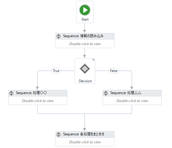 エラーへの直接の対処ではありませんが、ロボットの見通しをよくすることでエラーが生じたとしても対処がしやすくなります。各アクティビディをそのまま並べる形でロボット開発を行っても機能としては問題ないのですが、ロボットの規模が大きくなると見通しが悪くなってしまいます。見通しをよくするために、処理の目的ごとにグループ化して考え、適切な名前をつけたSequenceアクティビティやFlowchartアクティビティをつなぐ形でロボットを作るとよいでしょう。こうすることで、各アクティビティの関係性や全体構造が見やすくなりデバッグもしやすくなります。