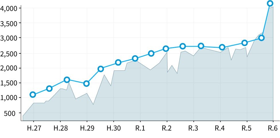 <img src="graph-sales-2024.png" alt="平成27年から令和6年までのグラフ。約1,000から約4,000まで右肩上がりで増加">