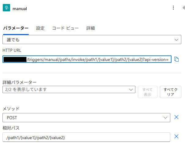 パスパラメーターから取り出す場合、トリガー設定の「相対パス」に/path1/{value1}/path2/{value2}のような形式を入力します。すると、トリガー設定に表示されているリクエストURLのパス末尾に/path1/{value1}/path2/{value2}が追加されます。