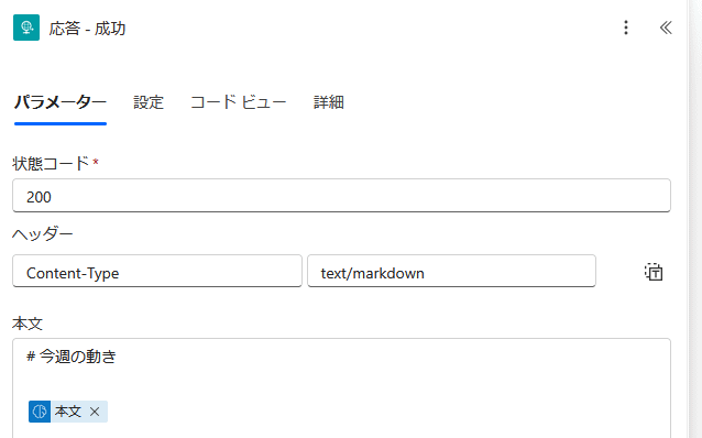 レスポンスボディにはJSONを指定することがほとんだと思いますが、JSON以外も可能です。アクションの設定でHTTPヘッダーを指定できるため、Content-Typeにtext/markdownを指定して、Markdownを返すこともできます。