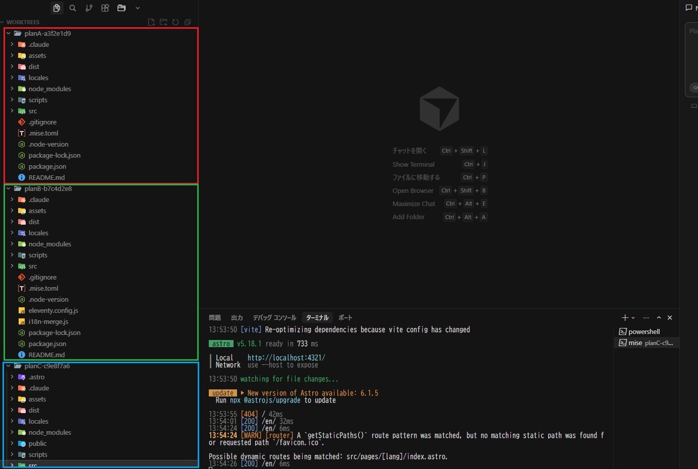 そこで、互いに独立した実装案としてそれぞれがどのような形になるのかを一覧で比較したいと考え、/worktreeで作業ツリーを分け、案ごとにエージェントに実装してもらう形にしました。
