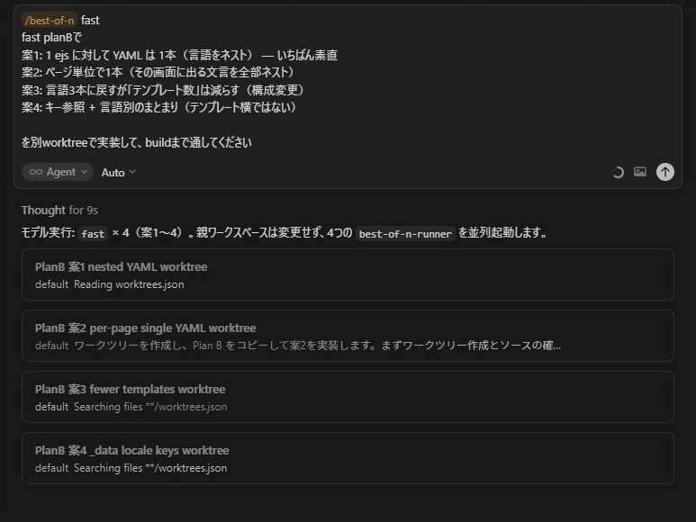 Cursor3のworktreeコマンドとbest-of-nコマンドを使ってi18nの実装案の比較をしてみた