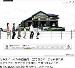 住まい選びが持つ本来の楽しさを体験していただくために、Enjoy! Ecolife with ECOHEIMでは仮想の住宅展示場の中を楽しみながら探索していく、という設定で企画しました。また、光熱費ゼロ、地震に強い、住めば住むほど費用が割安になる、といったセキスイハイムの優れた特徴を説明するために、展示場のほか、自然に満ち溢れた公園という設定も用意しました。ユーザーは自分で選んだキャラクターを展示場や自然の中をマウスや矢印キーを使って歩かせたり、走らせたりしながら資料請求を行います。ただカタログを見せるのではなく、住まい選びに参加してもらうことで、すこしでもセキスイハイムの素晴らしさやメッセージを利用者に伝えられればと考えました。