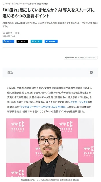 2026年2月4日に開催されたイベント「デジタルマーケターズサミット2026 Winter」の登壇レポート記事を、株式会社インプレス「Web担当者Forum」に掲載いただきました。