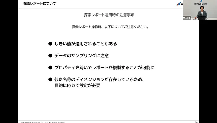 この度はセミナーへのご参加、誠にありがとうございました。昨年11月の公演時と同内容のセミナーを開催させていただきましたが、「初心者でもかなり分かりやすい内容で、操作画面でも説明をしてくださったのでとても良かったです。」「GA4のレポートの作り方が非常に分かりやすかった。」など好評をいただき、皆さまのお役に立てる情報をお届けできたことを大変嬉しく思っております。ぜひ、業務での探索レポートの活用に参考になれば幸いです。一方で、「自由形式」以外のレポートや、探索レポートの作成事例などは充分に解説しきれませんでした。これらの課題も踏まえまして、分析の実例など、実践的な題材を取り扱ったセミナーも開催できればと考えています。当社にはGA4に精通した分析のスペシャリストが多数在籍しています。各担当者が皆さまにヒアリングを行い、課題解決に向けて全力でサポートいたします。GA4や探索レポートの活用で課題を少しでもお持ちであれば、お気軽にミツエーリンクスにご相談くださいませ。