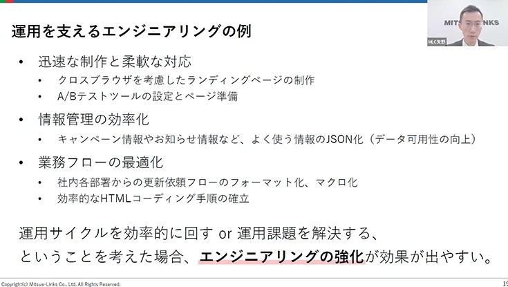 次に、Webサイト運用の現場で起きている課題として、UI改善やSEO対策が進まない、ナレッジが属人化している、業務特性に応じた適切なリソース配置ができていないといった問題を紹介。こうした問題に対し、制作効率化やA/Bテスト環境の準備、更新フローの標準化など、エンジニアリングの強化が運用サイクルの効率化に貢献すると説明しました。さらに、RPAとエンジニアリングを組み合わせることで、日々の繰り返し業務を自動化し、運用効率を向上できることを、実際のRPAデモを交えて説明しました。