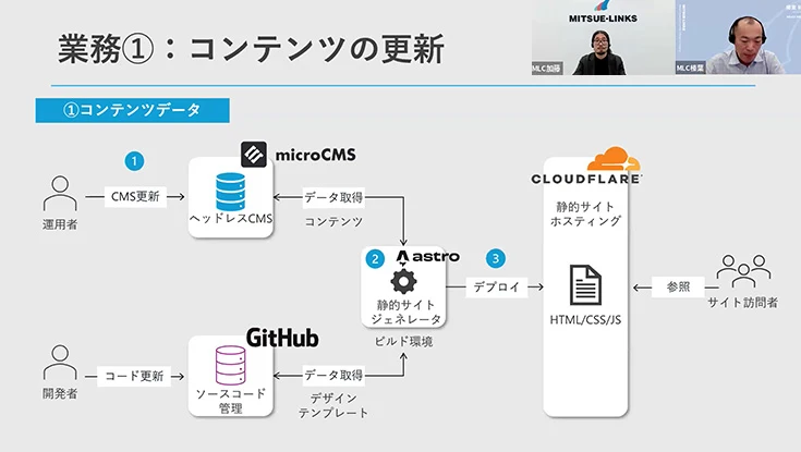 これらを連携することで、安全かつ効率的にWebサイトを公開できる仕組みです。セミナーでは、具体例として、コンテンツ管理に microCMS、高速で安定した配信には Cloudflare、ソースコード管理と自動更新には GitHub を活用する構成を紹介しました。