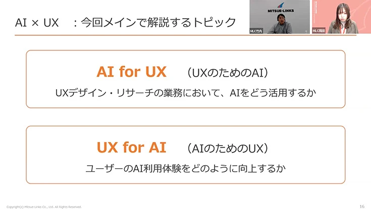 次に、AI×UX のトレンドとして「AI for UX(UXのためのAI)」と「UX for AI(AIのためのUX)」の二つの視点を紹介しました。「AI for UX」では、UXリサーチャーがユーザー分析の過程で行うインタビュー内容の整理といった、手間のかかる工程をAIが補助する事例を取り上げました。特に、AIがペルソナになりきって対話する「疑似ペルソナ」は、調査結果をデザインへつなげやすくする方法として注目されています。一方「UX for AI」では、ユーザーの閲覧履歴や検索履歴をもとに、おすすめの投稿や動画を自動的に表示する仕組みであるSNSのレコメンド機能が紹介されました。しかし、AIの過度なレコメンドがユーザー体験を損なうといった課題が指摘されました。AIを利用した体験を適切に設計するには、ユーザーの意図を読み取り、検証を重ねるといった人間側の判断が不可欠です。そして、AIと人の役割を適切に分担することが、重要だとまとめました。